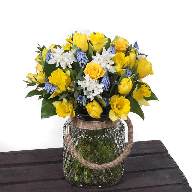 Spring hand tied of striking yellow daffodils, yellow tulips, white narcissus and dainty blue mascari.