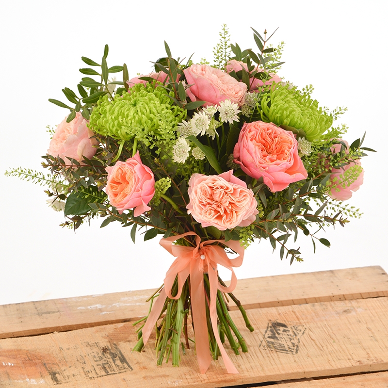 Start the summer with a mixture of peonies and lime green spiky chrysanths with eucalyptus. A wonderful handtied to brighten anyones day.