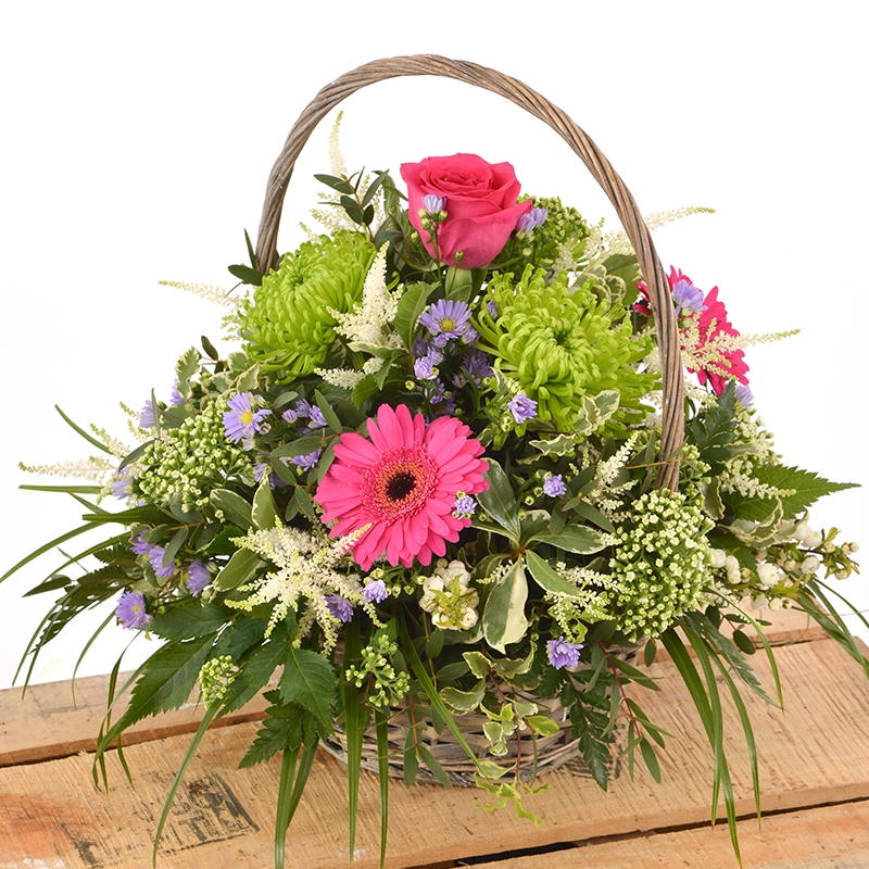 A basket full of summer flowers including pink roses and gerbera.
