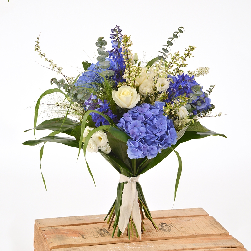 Reflecting the blues and whites of the summer sky, Beach is an elegant handtied with Blue Hydraenga, Delphinium and White Roses.