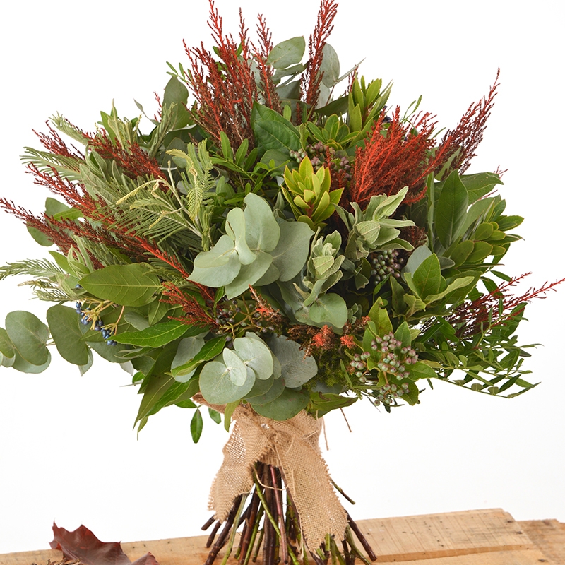 Berries with a variety of mixed foliage for a woodland themed handtied bouquet.