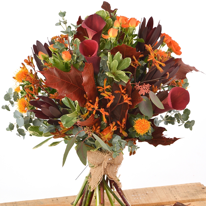 Rich browns, oranges and reds in a combination of stunning Calla Lilies, Kangaroo Paw and Carthamus.