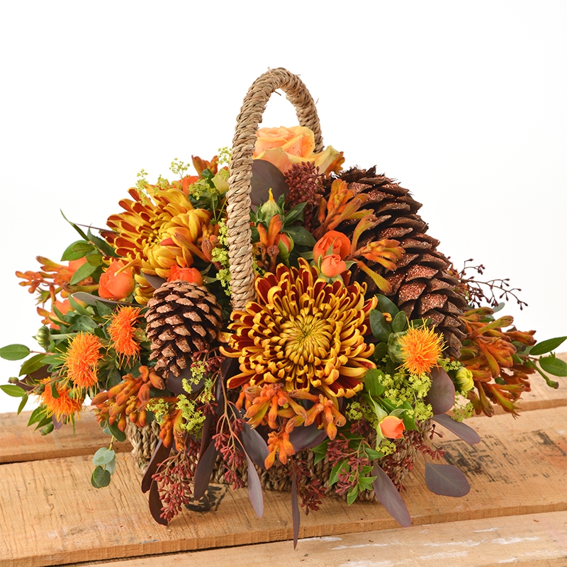 A festival of delight in this autumnal basket including large bloom Chrysanthum, Carthamus and pine cones.
