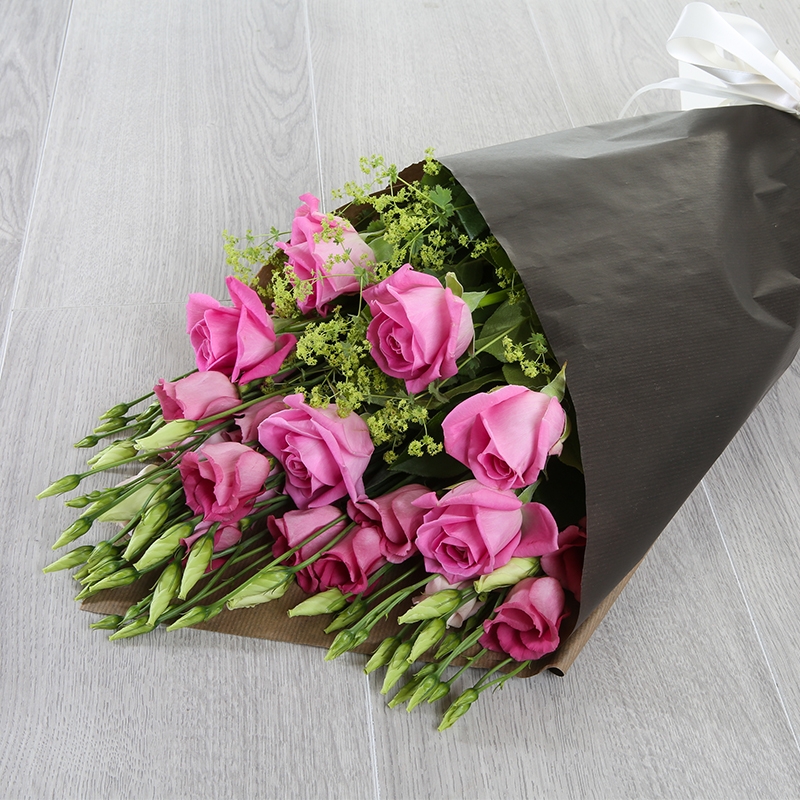 Perfect pinks all round for our Alaia bouquet, made lovingly by hand using roses, Lisianthus and Alchemilla Mollis.