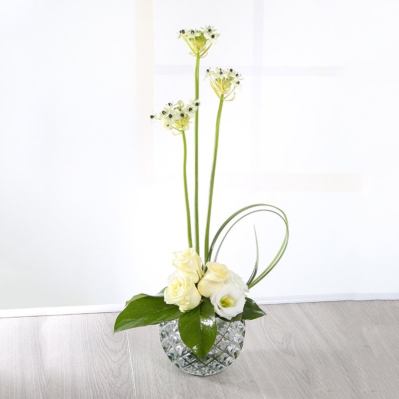A modern glass bowl arrangement including Roses and Lisianthus.