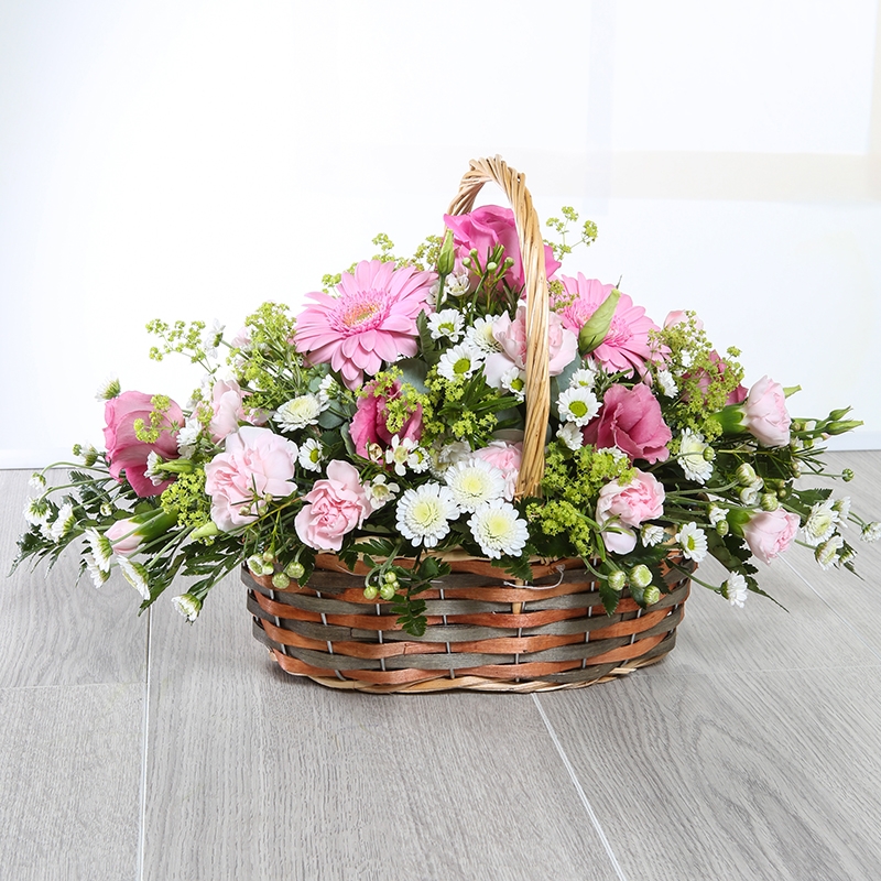 Our charming Beatrice basket is a tradtional favourite, full of the nations favourite blooms including Roses, Carnations and Chrysanthemum.
