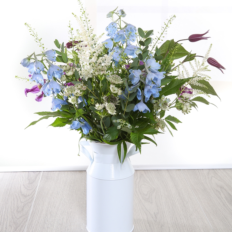 After an arrangement with a country twist? Elena is the one for you! Using some unusual blooms such as Astilbe, Delphinum, Astrantia and Clematis makes this a lovely arranagement.