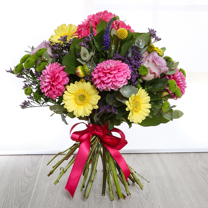 Need some sunshine on a cloudy day? Then our beautiful Florianna is the bouquet for you! Full of cheerful blooms including Hydrangea, Germini, Sea Lavender, Dahlia and Roses.