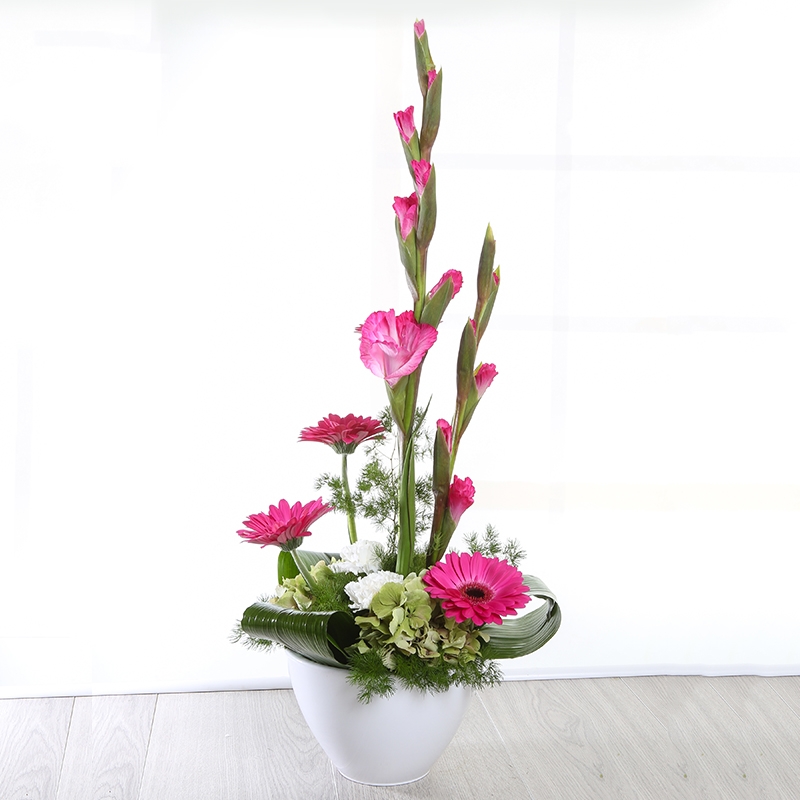 This stunning arrangement includes bright pink shades of Gladioli, Gerberas and Carnations. Fortuna makes the perfect gift for any occasion.