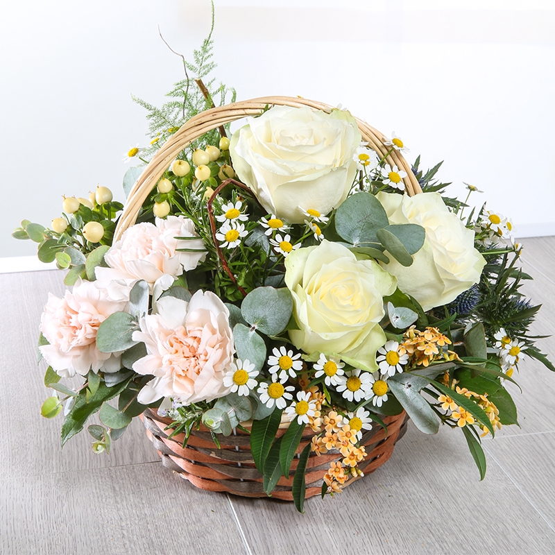 Our woodland themed Jayde basket is perfect for bringing a charming country feel gift. Using classic colours and combination of flowers creates this basket, including Roses, Thistle and Carnations.