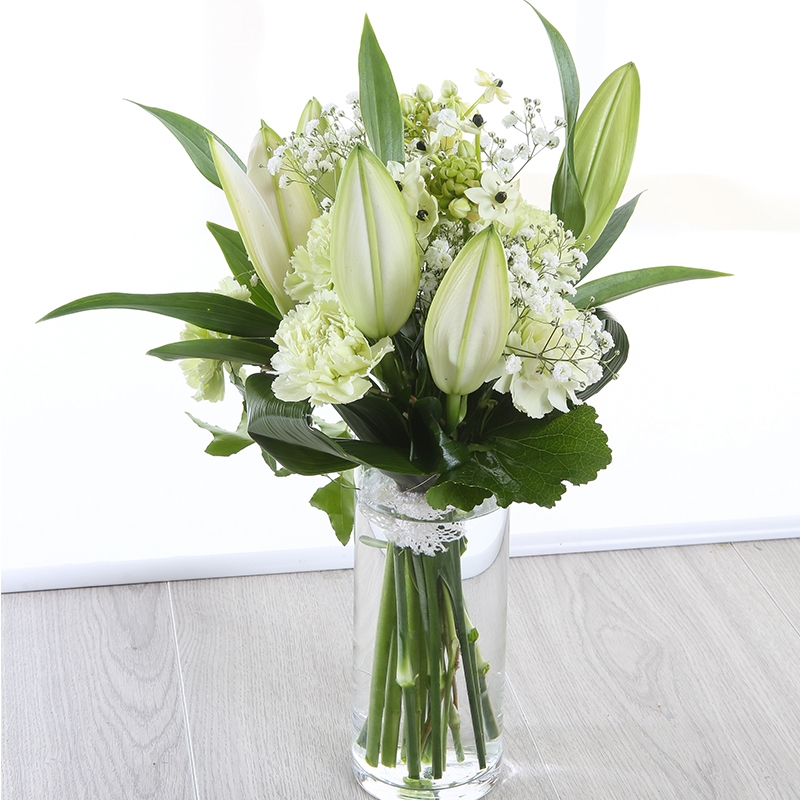 Beautiful Oriental Lilies are complemented by Carnations and fresh flowers in our perfectly white Juno arrangement.