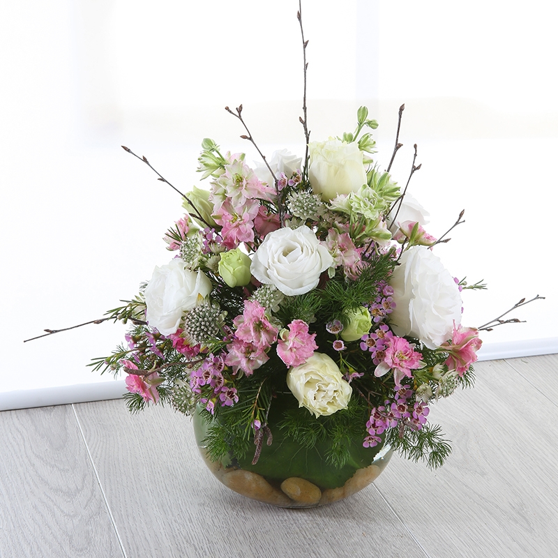 Our Luna arrangement is the perfect talking point, with its eye catching design in a glass bowl. Using fresh flowers including Roses, creates a luxurious finish.