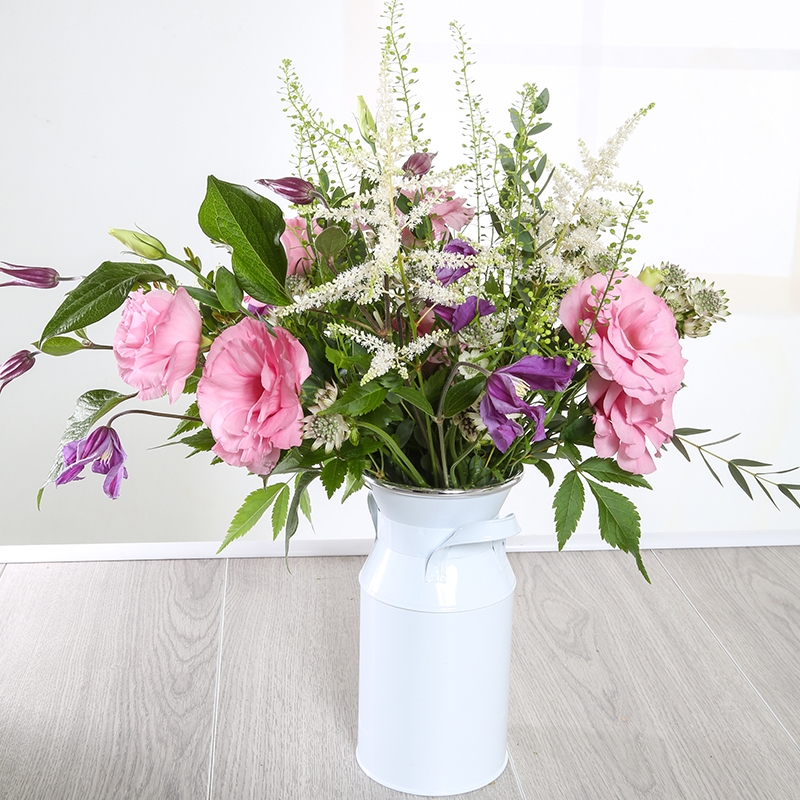 Our beautiful Macaria design is the perfect gift for any special occassion. Fresh blooms of Astilbe, Clematis, Lisianthus and Thlaspi in soft pink, purple and cream tones are skilly presented in a white churn for a modern feel.