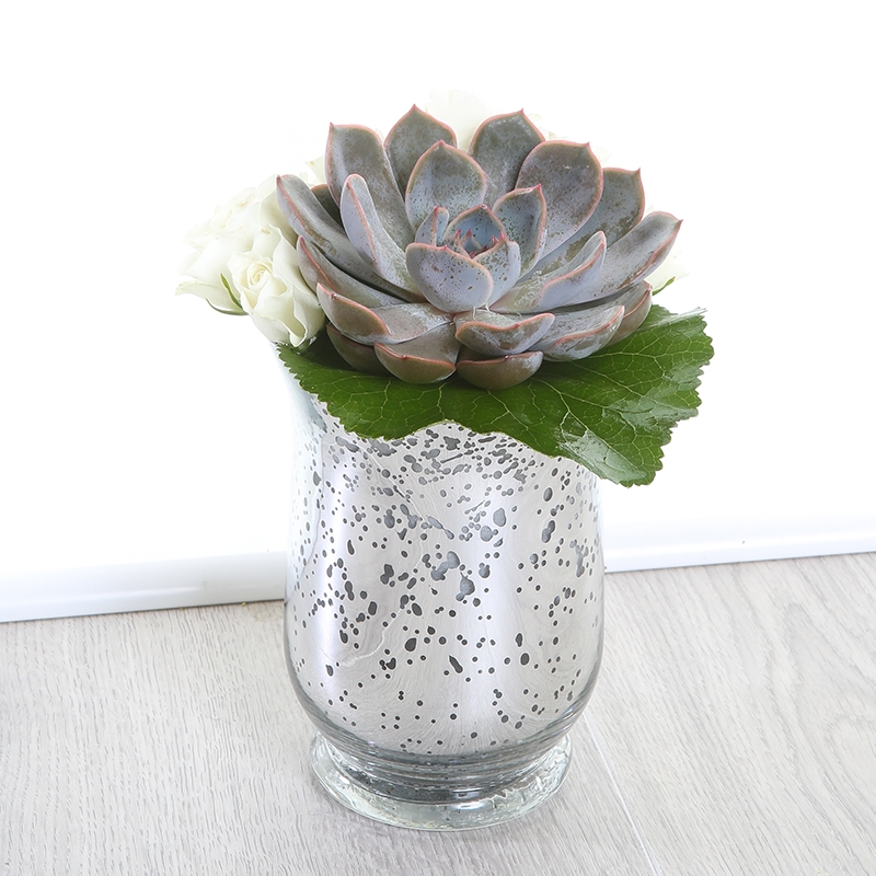 Stylish Succulents are the focal point of Nessa, complemented by rose and galix leaf.
