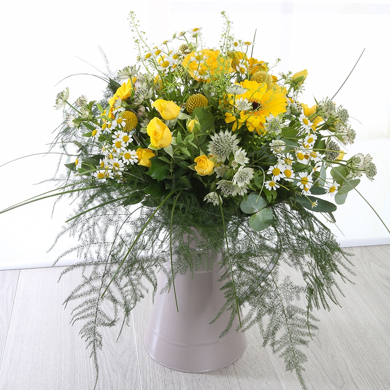 Our Pandora arrangement has an elegant hand-gathered effect, for a natural finish. Carefully created by our skilled florists, Pandora containsa selection of sun coloured flowers including Germini, Roses, Astrantia and Fern.