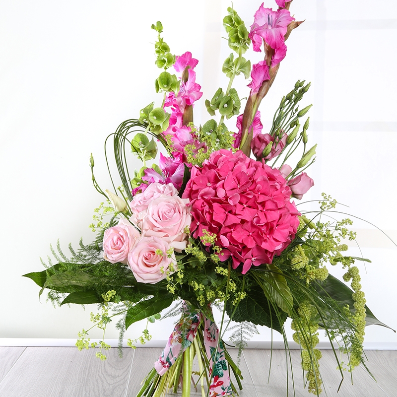 Rosalie is a bold bouquet, with bright blooms to add colour to any day. Created with care, the hand-tied bouquet contains a selection of fresh flowers including Hydrangea, Gladiolus, Roses and Palm.