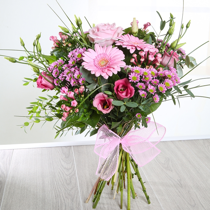 Our Tabitha bouquet is full of our very favourite pink blooms, including Roses, Lisianthus and Santini. This pretty pink bouquet will brighten up any special occassion!