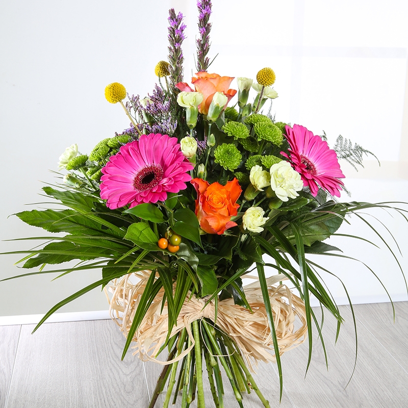 Our vibrant hand-tied Valentina is a striking bouquet, making it a perfect gift for any occassion. Full of fresh. colourful flowers including  Gerbera, Roses and Carnations.