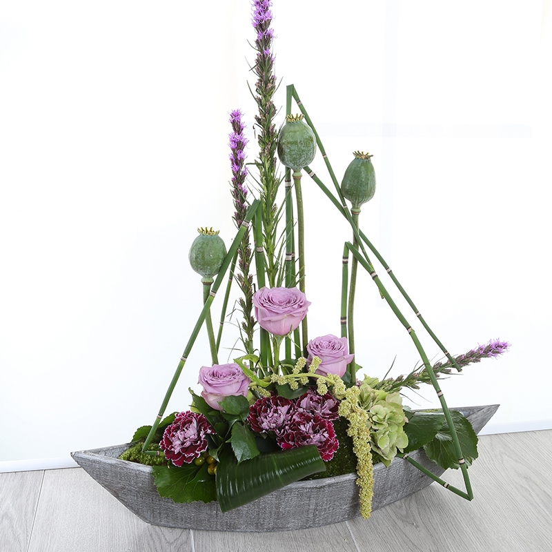 Sail away with this impressive arrangement, using a mixture of lilacs, purples and greenery. Flowers include Roses, Hydrangea and Aspidistra.