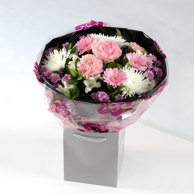 Delicate pink and white flowers wrapped and delivered in one of our gift bags. A wonderful gift.