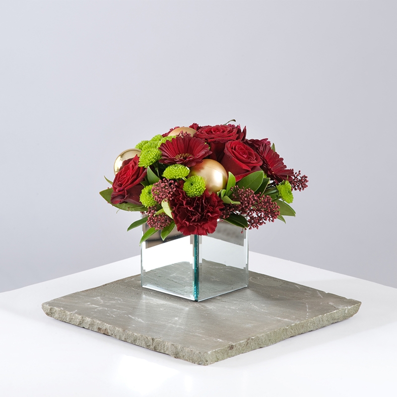 Table arrangment of burgundy roses and germini, green chrysanth, skimmia and christmas decorations.