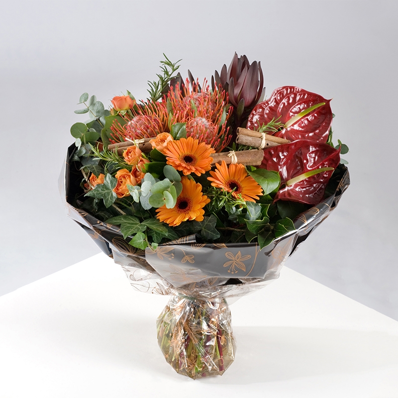 A contemporary handtied arrangement of tropical flowers, elegantly gift wrapped.