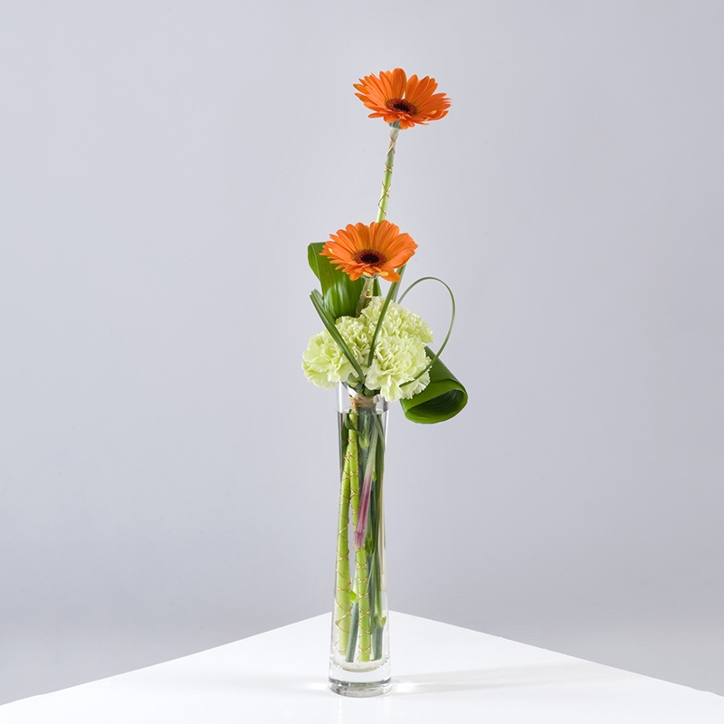 A modern table vase arrangement consisting of gerbera, carnations and foliage.
