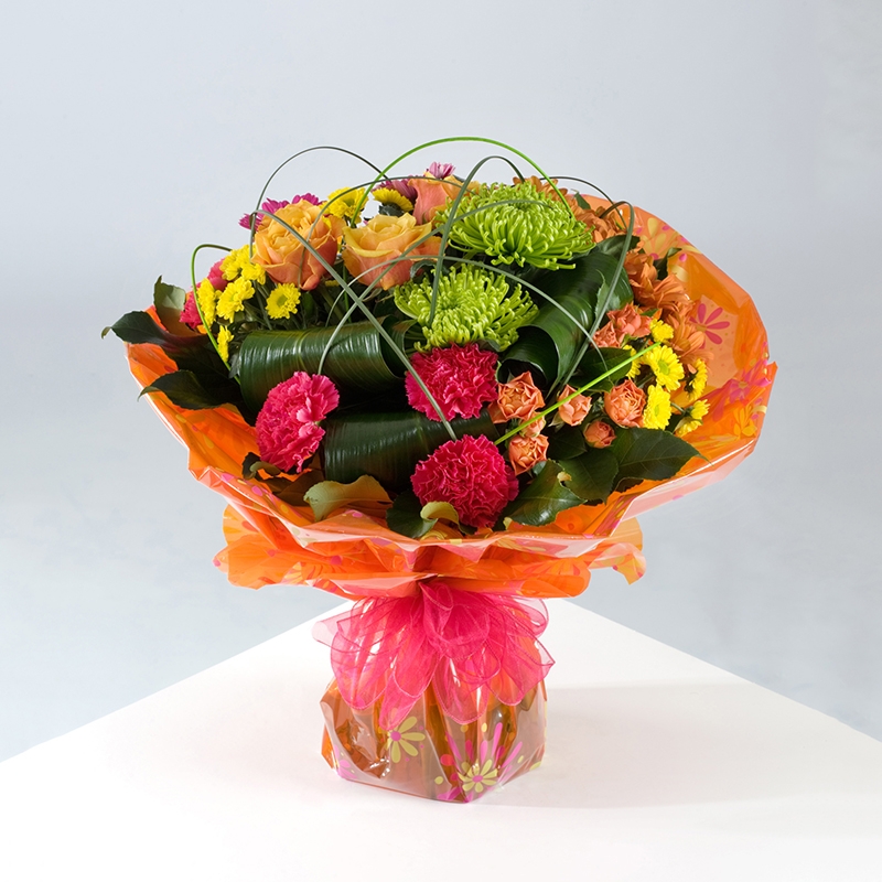 From the award winning designer Neil Whitakker this stunning large Vibrant handtied bouquet is gift wrapped and presented in water.
