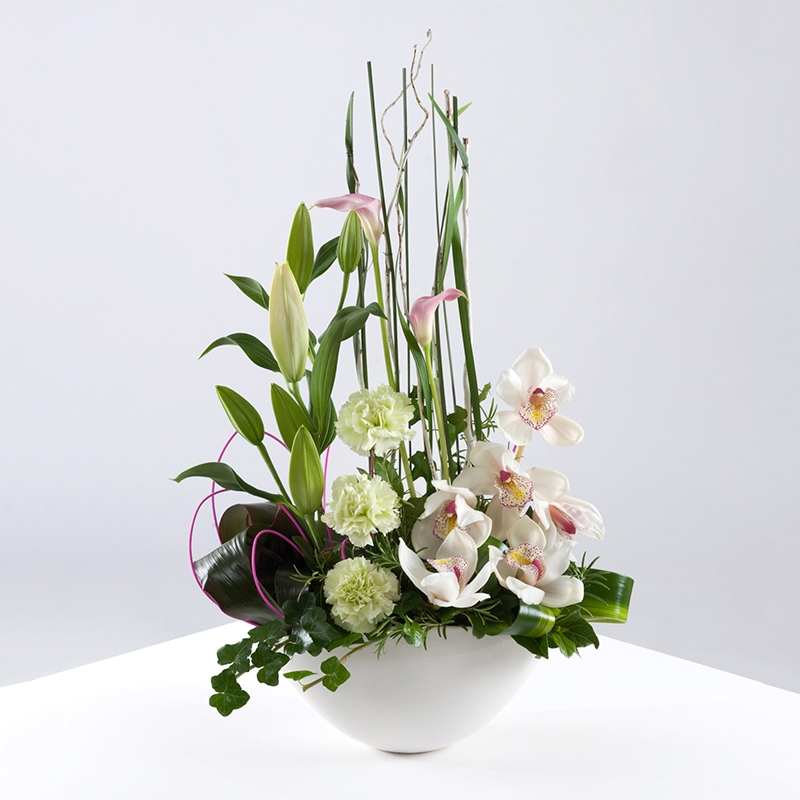 A stunning modern arrangement of lilies, orchids, carnations and foliage set within a ceramic container.