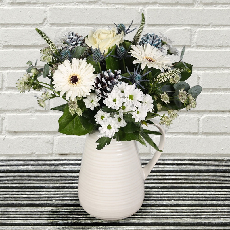Hand tied bouquet in a ceramic white jug, icey blue cones, and thistles amongst white chrysanthemum, white germini, white astrantia and white veronica.